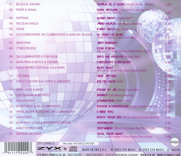 01. BLOCK & CROWN "KARMA IS A KILLER, (Makin Bakin Remix)" 02. PHATS & SMALL "TURN AROUND (HEY WHAT S WRONG WITH YOU), (Les Bisous Remix)" 03. SOFTMAL "LADIES NIGHT, (Radio Edit)" 04. NICOLAS HAELG "MIND GAMES, (Les Bisous Remix)" 05. LISSAT "SWEET DISCO, (Nu Disco Mix)" 06. LUCA DEBONAIRE, DA CLUBBMASTER & MAICKEL TELUSSA "LA TRIBU DE DANA, (Saint Tropez Capz Club Mix)" 07. Finn, Sean "AIN T NOBODY" 08. CYBER PEOPLE "VOID VISION, (Block & Crown Rimini 1985 Radio Edit)" 09. DA CLUBBMASTER X TOM PULSE "INTO THE GROOVE, (Radio Edit)" 10. SEAN FINN & BLOCK & CROWN "EVERYBODY EVERYBODY" 11. SAINT TROPEZ CAPS FEAT. LOLA PARIS "BABY BABY, (Block & Crown Nu Disco Radio Edit)" 12. JOE DIEM "RING MY BELL" 13. DISCO CULTURE FEAT. GREG & GREGORY "STAYIN ALIVE, (Edit)" 14. SWAY GRAY & BATEZ "STAND BY ME, (Sway Gray Mix)" 15. CAT DEALERS & BEOW?LF "INFINITY, (Les Bisous Remix)" 16. SOULCHASER "CONNECTION, (Radio Mix)" 17. DJ SKYWALK & DA CLUBBMASTER "BOOGIE WONDERLAND, (Makin Bakin Remix)" 18. 49ERS, BLOCK & CROWN, DA CLUBBMASTER "I NEED YOU" 19. JUNGSTEDT "ENJOY YOUR LIFE, (Sticky Decks Radio Remix)" 20. SEAN FINN, LOTUS & THE POINTER SISTERS "AUTOMATIC" 21. SAINT TROPEZ CAPS "DROWNING, (Block & Crown Nu Disco Edit)" 22. McCrae, George "ROCK YOUR BABY, (Da Clubbmaster X Tom Pulse Disco Edit)"