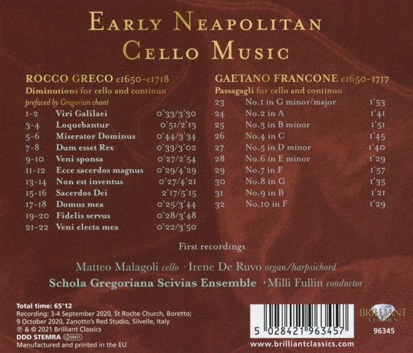 01. Schola Gregoriana Scivias Ensemble "Gregorianischer Choral" 02. Malagoli, Matteo "Viri Galilaei (Diminution für Violoncello und Basso continuo)" 03. Schola Gregoriana Scivias Ensemble "Gregorianischer Choral" 04. Malagoli, Matteo "Loquebantur (Diminution für Violoncello und Basso continuo)" 05. Schola Gregoriana Scivias Ensemble "Gregorianischer Choral" 06. Malagoli, Matteo "Miserator Dominus (Diminution für Violoncello und Basso continuo)" 07. Schola Gregoriana Scivias Ensemble "Gregorianischer Choral" 08. Malagoli, Matteo "Dum esset Rex (Diminution für Violoncello und Basso continuo)" 09. Schola Gregoriana Scivias Ensemble "Gregorianischer Choral" 10. Malagoli, Matteo "Veni sponsa (Diminution für Violoncello und Basso continuo)" 11. Schola Gregoriana Scivias Ensemble "Gregorianischer Choral" 12. Malagoli, Matteo "Ecce sacerdos magnus (Diminution für Violoncello und Basso continuo)" 13. Schola Gregoriana Scivias Ensemble "Gregorianischer Choral" 14. Malagoli, Matteo "Non est inventus (Diminution für Violoncello und Basso continuo)" 15. Schola Gregoriana Scivias Ensemble "Gregorianischer Choral" 16. Malagoli, Matteo "Sacerdos Dei (Diminution für Violoncello und Basso continuo)" 17. Schola Gregoriana Scivias Ensemble "Gregorianischer Choral" 18. Malagoli, Matteo "Domus mea (Diminution für Violoncello und Basso continuo)" 19. Schola Gregoriana Scivias Ensemble "Gregorianischer Choral" 20. Malagoli, Matteo "Fidelis servus (Diminution für Violoncello und Basso continuo)" 21. Schola Gregoriana Scivias Ensemble "Gregorianischer Choral" 22. Malagoli, Matteo "Veni electa mea (Diminution für Violoncello und Basso continuo)" 23. Malagoli, Matteo "Passacaglia für Violoncello und Basso continuo Nr. 1 g-moll/G-Dur" 24. Malagoli, Matteo "Passacaglia für Violoncello und Basso continuo Nr. 2 A-Dur" 25. Malagoli, Matteo "Passacaglia für Violoncello und Basso continuo Nr. 3 h-moll" 26. Malagoli, Matteo "Passacaglia für Violoncello und Basso continuo Nr. 4 C-Dur" 27. Malagoli, Matteo "Passacaglia für Violoncello und Basso continuo Nr. 5 d-moll" 28. Malagoli, Matteo "Passacaglia für Violoncello und Basso continuo Nr. 6 e-moll" 29. Malagoli, Matteo "Passacaglia für Violoncello und Basso continuo Nr. 7 F-Dur" 30. Malagoli, Matteo "Passacaglia für Violoncello und Basso continuo Nr. 8 G-Dur" 31. Malagoli, Matteo "Passacaglia für Violoncello und Basso continuo Nr. 9 H-Dur" 32. Malagoli, Matteo "Passacaglia für Violoncello und Basso continuo Nr. 10 F-Dur"