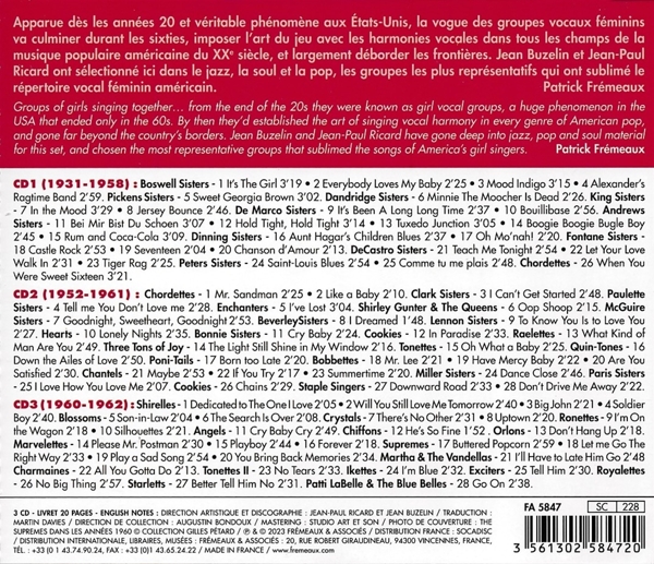 Disc 01 01. Boswell Sisters, The "It's The Girl" 02. Boswell Sisters, The "Everybody Loves My Baby" 03. Boswell Sisters, The "Mood Indigo" 04. Boswell Sisters, The "Alexander's Ragtime Band" 05. The Pickens Sisters "Sweet Georgia Brown" 06. The Dandridge Sisters "Minnie The Moocher is Dead" 07. King Sisters, The "In The Mood" 08. King Sisters, The "Jersey Bounce" 09. The De Marco Sisters "It's Been A Long Long Time" 10. The De Marco Sisters "Bouillibase" 11. Andrews Sisters, The "Bei Mir Bist Du Schoen" 12. Andrews Sisters, The "Hold Tight, Hold Tight" 13. Andrews Sisters, The "Tuxedo Junction" 14. Andrews Sisters, The "Boogie Boogie Bugle Boy" 15. Andrews Sisters, The "Rum and Coca-Cola" 16. Dinning Sisters, The "Aunt Hagar's Children Blues" 17. Dinning Sisters, The "Oh Mo Nah" 18. Fontane Sisters, The "Castle Rock" 19. Fontane Sisters, The "Seventeen" 20. Fontane Sisters, The "Chanson d'amour" 21. The De Castro Sisters "Teach Me Tonight" 22. The De Castro Sisters "Let Your Love Walk In" 23. The De Castro Sisters "Tiger Rag" 24. The Peters Sisters "Saint-Louis Blues" 25. The Peters Sisters "Comme tu me plais" 26. Chordettes, The "When You Were Sweet Sixteen"
