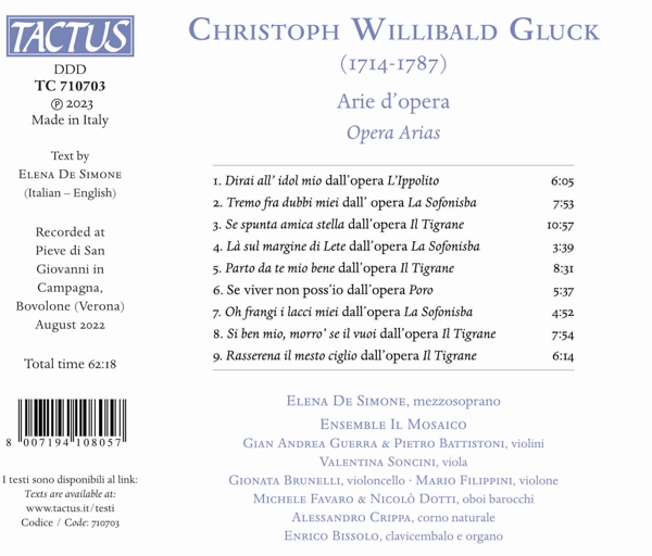 Beschreibung:This collection of arias from the operas Il Tigrane, Poro, La Sofonisba, L'Ippolito is a testimony of Christoph Willibald Gluck's opera activity from the year 1743 to 1745. At the age of 30, yet already successful composer, Gluck wrote his operas for the most important events in the cities of Crema, Turin and Milan, almost without a break. He seems to be at the peak of his career, yet he has not created those great compositions such as Orpheus and Euridice, Paride ed Elena, Alceste, that would have linked his name to the reform of opera theorised together with Ranieri de' Calzabigi and which made him one of the immortal names in the music history. The autographs of these arias no longer exist, nor the scores of the entire operas. Some pieces, sometimes with only basso continuo accompaniment, are all that remain of the enormous fortune that those performances had at the time. To be as close as possible to the original performance, arias with existing orchestral part have been chosen, except for the aria "Se viver non poss'io" from the opera Poro which was orchestrated from the basso continuo and some indication of the first violin motif, as complete scores of the opera Poro no longer exist. The curator of the work is Elena de Simone herself, a mezzo-soprano that - accompanied by Il Mosaico ensemble - already distinguished herself with the rediscovery of the works by Hasse and Maria Teresa Agnesi (Tactus' TC690801, TC720101 and TC720102)., Runningtime: 00:00:00, Cello: Gionata Brunelli, Ensemble: Ensemble Il Mosaico, Harpsichord, Organ: Enrico Bissolo, Horn [Natural Horn]: Alessandro Crippa, Liner Notes [English Translation]: Maria Assunta Ciardullo, Mezzo-soprano Vocals, Solo Vocal, Liner Notes: Elena De Simone, Oboe [Baroque Oboe]: Michele Favaro, Oboe [Baroque Oboe]: Nicolò Dotti, Recorded By, Edited By: Michele Fontana, Viola: Valentina Soncini, Violin: Gian Andrea Guerra, Violin: Pietro Battistoni, Violone: Mario Filippini, Labelcode TCS710703.2 (TC 710703), Phonographic Copyright (p) Tactus s.a.s. di Gian Enzo Rossi & C., Recorded At Pieve Di S. Giovanni In Campagna, Bovolone (Verona)