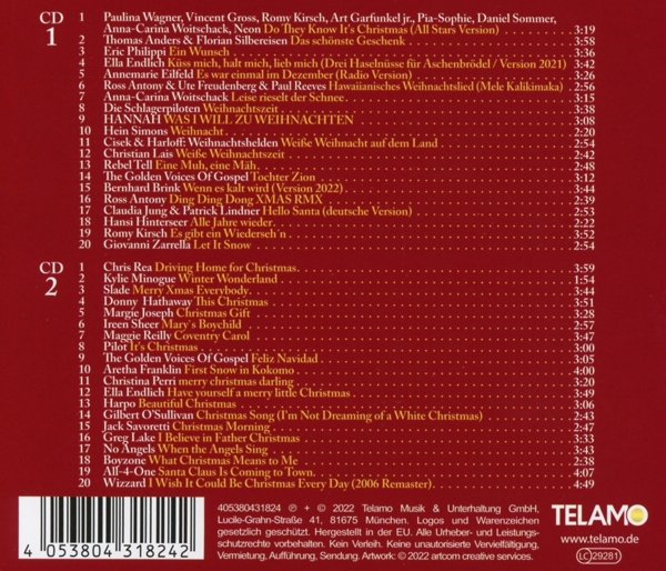 Disc 01 01. Wagner, Paulina / Gross, Vincent / Kirsch, Romy / Garfunkel, Art Jr. / Pia-Sophie / +++ "Do they know it's Christmas (All Stars Version)" 02. Anders, Thomas / Silbereisen, Florian "Das sch?nste Geschenk" 03. Philippi, Eric "Ein Wunsch" 04. Endlich, Ella "Küss mich, halt mich, lieb mich (Drei Haselnüsse für Aschenbr?del / Version 2021)" 05. Eilfeld, Annemarie "Es war einmal im Dezember (Radio Version)" 06. Antony, Ross / Freudenberg, Ute / Reeves, Paul "Hawaiianisches Weihnachtslied (Mele Kalikimaka)" 07. Woitschack, Anna-Carina "Leise rieselt der Schnee" 08. Schlagerpiloten, Die "Weihnachtszeit" 09. HANNAH "WAS I WILL ZU WEIHNACHTEN" 10. Simons, Hein "Weihnacht" 11. Cisek & Harloff: Weihnachtshelden "Weiße Weihnacht auf dem Land" 12. Lais, Christian "Weiße Weihnachtszeit" 13. Rebel Tell "Eine Muh, eine M?h" 14. Golden Voices Of Gospel, The "Tochter Zion" 15. Brink, Bernhard "Wenn es kalt wird (Version 2022)" 16. Antony, Ross "Ding Ding Dong (XMAS RMX)" 17. Jung, Claudia / Lindner, Patrick "Hello Santa (Deutsche Version)" 18. Hinterseer, Hansi "Alle Jahre wieder" 19. Kirsch, Romy "Es gibt ein Wiederseh'n" 20. Zarrella, Giovanni "Let it snow"