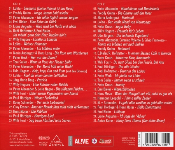 Disc 02 01. Alexander, Peter "Mandolinen und Mondschein (Mandolins in the moonlight)" 02. Quinn, Freddy "Die Gitarre und das Meer" 03. Andergast, Maria "Mariandl" 04. Lolita "Der weiße Mond von Maratonga" 05. Kraus, Peter "Sugar Baby" 06. Hagara, Willy "Freunde für's Leben (Down by the riverside)" 07. Jürgens, Udo "Der lachende Vagabund" 08. Alexander, Peter / Valente, Caterina / Francesco, SIlvio "Komm ein bisschen mit nach Italien" 09. Quinn, Freddy "Heimweh" 10. Bieler, Erni / Hofstetter, Rudi "In einem kleinen Caf? in Hernals" 11. Kraus, Peter "Schwarze Rose, Rosemarie" 12. Forst, Willi "Du hast Glück bei den Frau'n, Bel Ami" 13. H?rbiger, Paul "Der alte Sünder" 14. Hofstetter, Rudi "Drunt in der Lobau" 15. Weck, Peter "Ich pfeife aus Liebe (Take time to be happy)" 16. Sailer, Toni "Immer wenn es schneit" 17. Kraus, Peter "Sweety" 18. Bieler, Erni "Mauerblümchen (A sweet old fashioned girl)" 19. Moser, Hans "Wenn der Herrgott net will, nutzt es gar nix" 20. Leopoldi, Hermann "I bin a stiller Zecher" 21. Schmedes, Maria von "Es geht alles vorüber, es geht alles vorbei" 22. H?rbiger, Paul / Moser, Hans "Hallo Dienstmann" 23. Bieler, Erni "Lollipop" 24. Augustin, Liane "Ich sage dir "Adieu" (Just walking in the rain)" 25. Karas, Anton "Harry Lime Thema (Der dritte Mann)"