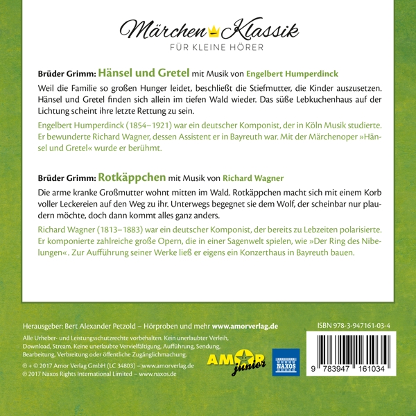 01. L?bbert, Aischa-Lina / Altmann, Jonathan / H?ller, Lola / Logemann, Frank / +++ "Große Not (H?nsel und Gretel, Ouvertüre)" 02. L?bbert, Aischa-Lina / Altmann, Jonathan / H?ller, Lola / Logemann, Frank / +++ "Die Sache mit den Steinchen (H?nsel und Gretel, Brüderchen, komm tanz mit mir)" 03. L?bbert, Aischa-Lina / Altmann, Jonathan / H?ller, Lola / Logemann, Frank / +++ "Ganz verloren im Wald (H?nsel und Gretel, wenn sie sich verirrten im Walde dort)" 04. L?bbert, Aischa-Lina / Altmann, Jonathan / H?ller, Lola / Logemann, Frank / +++ "Das leckere Knusperh?uschen (H?nsel und Gretel, Abends, will ich schlafen gehen)" 05. L?bbert, Aischa-Lina / Altmann, Jonathan / H?ller, Lola / Logemann, Frank / +++ "Die Macht der Hexe (H?nsel und Gretel, der Hexenritt)" 06. L?bbert, Aischa-Lina / Altmann, Jonathan / H?ller, Lola / Logemann, Frank / +++ "Gute Hilfe der tierischen Freunde (H?nsel und Gretel, ein M?nnlein steht im Walde)" 07. L?bbert, Aischa-Lina / Altmann, Jonathan / H?ller, Lola / Logemann, Frank / +++ "Die Hexe wird besiegt (H?nsel und Gretel, Juchhei! Nun ist die Hexe tot und Erl?st, befreit, für alle Zeit!)" 08. L?bbert, Aischa-Lina / Altmann, Jonathan / H?ller, Lola / Logemann, Frank / +++ "Die Freude der Eltern (H?nsel und Gretel, Erl?st befreit. für alle Zeit!)" 09. Fehn, Gerhard / Rattenni, Jannis / Rahma, Jana / Bergmann, Christian / Weber, Dominik Paul / +++ "Das wundersch?ne Pferd des Magiers (Sinfonie nr. 5, Allegro vivace)" 10. Fehn, Gerhard / Rattenni, Jannis / Rahma, Jana / Bergmann, Christian / Weber, Dominik Paul / +++ "Prinz Firus hoch am Himmel (Streichquartett in C-Dur)" 11. Fehn, Gerhard / Rattenni, Jannis / Rahma, Jana / Bergmann, Christian / Weber, Dominik Paul / +++ "Im Schloss von Prinzessin Indira (Impromptus nr. 3)" 12. Fehn, Gerhard / Rattenni, Jannis / Rahma, Jana / Bergmann, Christian / Weber, Dominik Paul / +++ "Prsische Hochzeitsvorbereitungen (Forellenquintett)" 13. Fehn, Gerhard / Rattenni, Jannis / Rahma, Jana / Bergmann, Christian / Weber, Dominik Paul / +++ "Der b?se Magier (Der Tod und das M?dchen, Andante con moto)" 14. Fehn, Gerhard / Rattenni, Jannis / Rahma, Jana / Bergmann, Christian / Weber, Dominik Paul / +++ "Die Prinzessin Seltsam in Kaschmir (Die unvollendete, Allegro Moderato)" 15. Fehn, Gerhard / Rattenni, Jannis / Rahma, Jana / Bergmann, Christian / Weber, Dominik Paul / +++ "Eine lange Suche (Streichquartett in C-Dur)" 16. Fehn, Gerhard / Rattenni, Jannis / Rahma, Jana / Bergmann, Christian / Weber, Dominik Paul / +++ "Rettung mit dem Zauberpferd (Rosamunde)"