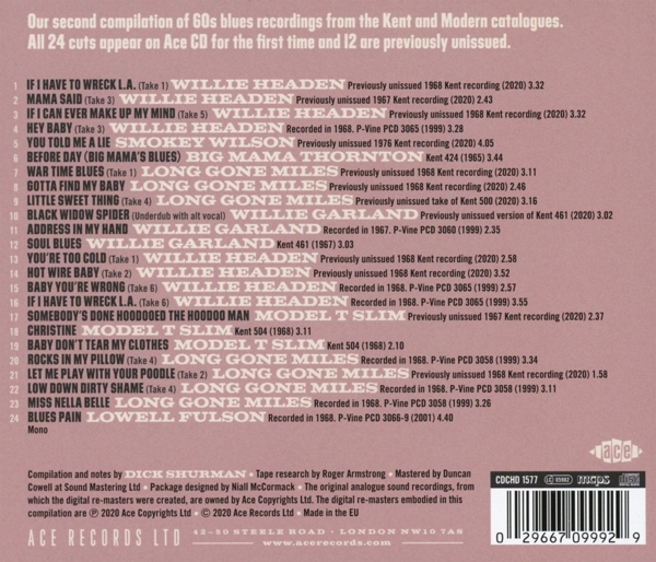 01. Headen, Willie "If I have to wreck L.A. (Take 1)" 02. Headen, Willie "Mama said (Take 3)" 03. Headen, Willie "If I can ever make up my mind (Take 5)" 04. Headen, Willie "Hey baby (Take 3)" 05. Wilson, Smokey "You told me a lie" 06. Thornton, Big Mama "Before day (Big Mama's blues)" 07. Long Gone Miles "War time blues (Take 1)" 08. Long Gone Miles "Gotta find my baby" 09. Long Gone Miles "Little sweet thing (Take 4)" 10. Garland, Willie "Black widow spider (Underdub With Alt Vocal)" 11. Garland, Willie "Address in my hand" 12. Garland, Willie "Soul blues" 13. Headen, Willie "You're too cold (Take 1)" 14. Headen, Willie "Hot wire baby (Take 2)" 15. Headen, Willie "Baby you're wrong (Take 6)" 16. Headen, Willie "If I have to wreck L.A. (Take 6)" 17. Model T Slim "Somebody's done hoodooed the hoodoo man" 18. Model T Slim "Christine" 19. Model T Slim "Baby don't tear my clothes" 20. Long Gone Miles "Rocks in my pillow (Take 4)" 21. Long Gone Miles "Let me play with your poodle (Take 2)" 22. Long Gone Miles "Low down dirty shame (Take 4)" 23. Long Gone Miles "Miss Nella Belle" 24. Fulson, Lowell "Blues pain"