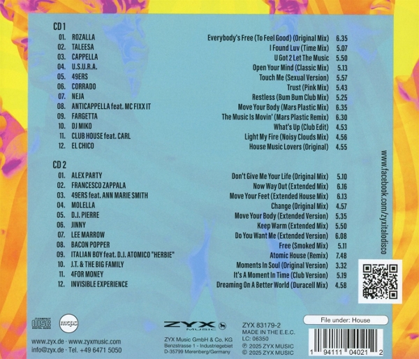 1-1: Everybody's Free (To Feel Good) (6:35) 1-2: I Found Luv (Time Mix) (5:07) 1-3: U Got 2 Let The Music (5:50) 1-4: Open Your Mind (Classic Mix) (5:13) 1-5: Touch Me (Sexual Version) (5:57) 1-6: Trust (Pink Mix) (5:43) 1-7: Restless (Bum Bum Club Mix) (5:25) 1-8: Move Your Body (Mars Plastic Mix) (6:35) 1-9: The Music Is Moving (Mars Plastic Remix) (6:30) 1-10: What's Up (Club Edit) (4:53) 1-11: Light My Fire (Noisy Clouds Mix) (4:56) 1-12: House Music Lovers (Original) (4:55) 2-1: Don't Give Me Your Life (Original Mix) (5:10) 2-2: Now Way Out (Extended Mix) (6:16) 2-3: Move Your Feet (Extended House Mix) (6:13) 2-4: Change (Original Mix) (4:57) 2-5: Move Your Body (Extended Version) (5:35) 2-6: Keep Warm (Extended Mix) (5:50) 2-7: Do You Want Me (Extended Version) (6:08) 2-8: Free (Smoked Mix) (5:11) 2-9: Atomic House (Remix) (7:48) 2-10: Moments In Soul (Original Version) (3:32) 2-11: It's A Moment In Time (Club Version) (5:19) 2-12: Dreaming On A Better World (Duracell Mix) (4:58)