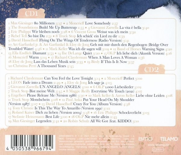Disc 01 01. Giesinger, Max "80 Millionen" 02. Moncrieff "Love somebody" 03. Foundations, The "Build me up buttercup" 04. Zarrella, Giovanni "La vita ? bella" 05. Philippi, Eric "Wir bleiben noch" 06. Gross, Vincent "Weisst was ich mein" 07. Rebel Tell "So bist Du" 08. Truck Stop "Ich schick' ein Lied zu dir" 09. Hasselhoff "Flying on the wings of tenderness (Radio Version)" 10. Garfunkel, Art Jr. / Garfunkel, Art / De Jong, Eloy "Geh mit mir durch den Regenbogen (Bridge over troubled water)" 11. Keller, Mark "Was ich dir sagen will" 12. Band Of Horses "Warning signs" 13. Endlich, Ella "Diamant" 14. DeLange, Ilse "Quiet" 15. Oli.P "Ich liebe dich (Akustik Version)" 16. Moncrieff "Warm" 17. Clayderman, Richard "When a man loves a woman" 18. De Jong, Eloy "Lass das Leben Musik sein" 19. Birdy "If this is it now" 20. Perri, Christina "A thousand years"