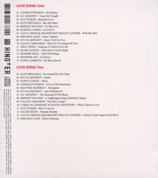 Disc 01 01. Evingson, Connie "Oh darling" 02. D.J. Sweeney "Teach me tonight" 03. Tucker, Sue "Beautiful love" 04. Michaels, Kate "Bye bye baby" 05. Maynes, Bridget "If I had you" 06. Castro, Marcie "Let's do it" 07. Smith, Lavay & Her Red Hot Skillet Lickers "With my man" 08. Sage, Miranda "Alone together" 09. Bennett, Sylvia "Since I fell for you" 10. Cardamon, Callie "Why Try To Change Me Now?" 11. Tippin, Thea "Someone to watch over me" 12. Kastel, Sandy "Why don't you do right" 13. Neill, Dennise "That old feeling" 14. Lee, Jennifer "You knew" 15. Lambeth, Dawn "My blue heaven"