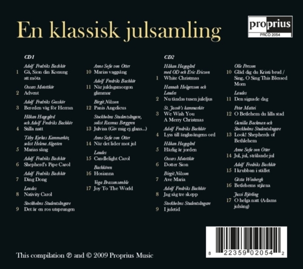 Disc 02 01. Ericson, Eric "White Christmas" 02. Holgersson, Hannas "Nu t?ndas tusen juleljus" 03. St. Jacobs Kammark?r "We wish you a Merry Christmas" 04. Adolf Fredriks Bachk?r "Lyss till ?nglas?ngens ord" 05. Hageg?rd, H?kan "H?rlig ?r jorden" 06. Oscars Motettk?r "Dotter Sion" 07. Nilsson, Birgit "Ave Maria" 08. Adolf Fredriks Bachk?r "Jag s?g tre skepp" 09. Stockholms Students?ngare "I juletid" 10. Persson, Olle "Sing, o sing this blessed morn" 11. Laudes "Den signade dag" 12. Mattei, Peter "O Bethlehem du lilla stad" 13. Backman, Gunilla "Look! Shepherds of Bethlehem" 14. Otter, Anne Sofie von "Jul, jul, str?lande jul" 15. Adolf Fredriks Bachk?r "I krubban i st?llet" 16. Winbergh, G?sta "Bethlehems stj?rna" 17. Bj?rling, Jussi "O helga natt (Adams juls?ng)"