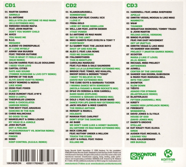 Beschreibung:Artwork: Martin Weiland, Artwork: Tobias Trettin, Producer [Additional CD Production]: Michi Lange, Remix: DJ Antoine vs. Mad Mark, Remix: W&W, Remix: Live City, Remix: Tommie Sunshine, Remix: David Guetta, Remix: Andhim, Remix: Bontan, Remix: Pleasurekraft, Remix: H.O.S.H., Remix: E-Partment, Remix: David May (3), Remix: Miami Rockets, Remix: Nicola Fasano, Remix: VooDoo & Serano, Remix: David May (3), Remix: DJ Antoine vs. Mad Mark, Remix: Martin Garrix, Remix: R.I.O, Remix: Blasterjaxx, Remix: Hardwell, Remix: Afrojack, Remix: David Jones (15), Labelcode 1063482KON, Phonographic Copyright (p) Kontor Records GmbH, Copyright (c) Kontor Records GmbH, Distributed By Edel Germany GmbH, Manufactured By Optimal Media GmbH