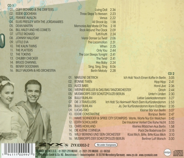 Disc 01 01. Cliff Richard & The Drifters "Living Doll" 02. Cochran, Eddie "Three Steps To Heaven" 03. Avalon, Frankie "Venus" 04. Elvis Presley With The Jordanaires "All Shook Up" 05. Martin, Dean "Memories Are Made Of This" 06. Bill Haley And His Comets "Rock Around The Clock" 07. Little Richard "Tutti Frutti" 08. Hallyday, Johnny "Viens Danser Le Twist" 09. Little Eva "The Locomotion" 10. Kalin Twins, The "When" 11. Platters, The "Only You" 12. Tokens, The "The Lion Sleeps Tonight" 13. Checker, Chubby "The Twist" 14. Bruce Channel "Hey Baby" 15. Goodman, Benny "Sing, Sing, Sing" 16. Billy Vaughn & His Orchestra "Berlin Melody"