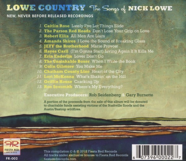 01. Rose, Caitlin "Lately I've Let Things Slide" 02. Parson Red Heads, The "Don't Lose Your Grip On Love" 03. Ellis, Robert "All Men Are Liars" 04. Shires, Amanda "I Love The Sound Of Breaking Glass" 05. JEFF The Brotherhood "Marie Provost" 06. Carll, Hayes "(I'm Gonna Start) Living Again If It Kills Me" 07. Enderlin, Erin "Lover Don't Go" 08. Unsinkable Boxer, The "When I Write The Book" 09. Gilmore, Colin "You Make Me" 10. Chatham County Line "Heart Of The City" 11. McKenna, Lori "What's Shakin' On The Hill" 12. Griffin House "Cracking Up" 13. Sexsmith, Ron "Where's My Everything?"