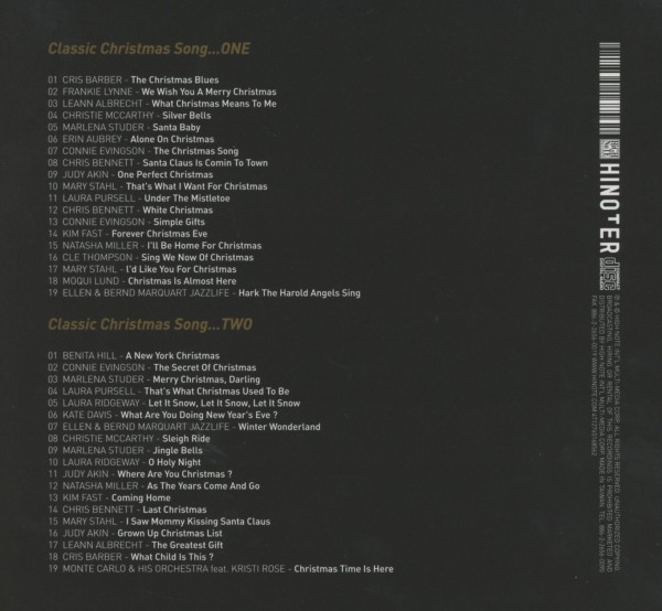 Disc 02 01. Hill, Benta "A New York Christmas" 02. Evingson, Connie "The secret of Christmas" 03. Studer, Marlena "Merry Christmas, darling" 04. Pursell, Laura "That's what Christmas used to be" 05. Ridgeway, Laura "Let it snow, let it snow, let it snow" 06. Davis, Kate "What are you doing new year's eve?" 07. Marquart, Ellen & Bernd Jazzlife "Winter wonderland" 08. McCarthy, Christie "Sleigh ride" 09. Studer, Marlene "Jingle bells" 10. Ridgeway, Laura "O holy night" 11. Akin, Judy "Where are you Christmas?" 12. Miller, Natasha "As the years come and go" 13. Fast, Kim "Coming home" 14. Bennett, Chris "Last Christmas" 15. Stahl, Mary "I saw mommy kissing Santa Claus" 16. Akin, Judy "Gown up Christmas list" 17. Albrecht, Leann "The greatest gift" 18. Barber, Chris "What child is this?" 19. Carlo, Monte & His Orchestra / Rose, Kristi "Christmas time is here"