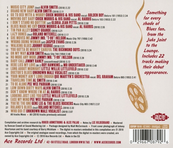 01. Smith, Alvin "Music city jump" 02. Smith, Alvin "Brand new baby" 03. Morris, Chick & His Band / Golden Boy "Go to bed with a worry" 04. Morris, Chick & His Band / Harris, Al "Moving out baby" 05. Pitts, Gloria Jean "I don't stand no quittin'" 06. Morris, Chick & His Band / Harris, Al "Blues made me cry" 07. Grande, Sidney "Tin pan alley" 08. Mitchell, Roland "Lazy bones" 09. Nelson, Jimmy (Mr."T-99") "She moves me" 10. Evans, Jasper "Wrong doing woman" 11. George, Johnny "Walking blues" 12. Richmond Boys, The "You gotta be mighty careful" 13. Smith, Alvin "On my way" 14. Nelson, Jimmy (Mr."T-99") "No more any more" 15. Raney, Jimmy "Baby call" 16. Hawkins, Roy alias Mr Undertaker "Here lies my love" 17. Littlefield, Little Willie "Long about midnight" 18. Unknown Male Vocalist "Doctor's blues" 19. Que Martyn's Orchestra / Graham, Del "Your money ain't long enough" 20. Smith, Al "Traveling time" 21. Parham, Pee Wee "To be alone" 22. Smith, Alvin "Low down dirty ways" 23. Harris, Al "Don't know where I'm at" 24. Littlefield, Little Willie "Looking just like you" 25. Parham, Pee Wee "Ease my mind" 26. Lee, Gene & The Blues Rockers "You're the one" 27. Mitchell, Roland "Roland's blues" 28. Unkown Male Vocalist "Who did it"