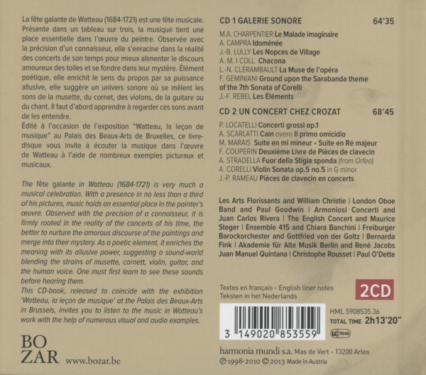 Disc 01 Le Malade Imaginaire (Der eingebildete Kranke, Oper): Prologue und Interm?des (Auszug) 01. Les Arts Florissants "Troisi?me interm?de: Overtüre - Entr?e de ballet Les Taoissiers" Idomeneo, R? di Creta KV 366 (Oper in 3 Akten) (Auszug) 02. Mopin, Anne "Musette (4. Akt)" 03. Mopin, Anne "Volez au son de nos musettes" Les Noces de Village 04. London Oboe Band "Ouvertüre" 05. London Oboe Band "Le Mari? et la Mari?e" 06. London Oboe Band "Six vieillards" 07. London Oboe Band "Les Messiers" 08. London Oboe Band "Bour?e pour les M?mes" 09. London Oboe Band "Les Boh?miens" 10. Rivera, Juan Carlos "La Chacona" La muse de l'op?ra ou Les caract?res lyriques (Kantate) (Auszug) 11. Rime, No?mi "Arie: Vos concerts hereux oyseaux" 12. Steger, Maurice "Sarabande (nach Sonate für Violine op. 5 Nr. 7 von Corelli)" Les l?ments (Symphonie nouvelle) (1737) (Auszug) 13. Kallweit, Georg "5. Rossignols" 14. Kallweit, Georg "6. Loude 2 - La chasse" 15. Kallweit, Georg "7. Tambourins 1 - Tambourins 2" 16. Kallweit, Georg "8. Sicilienne" Sonate für 2 Violinen und Basso continuo B-Dur RV 77 17. Ensemble 415 "1. Allegro" 18. Ensemble 415 "2. Andante" 19. Ensemble 415 "3. Allegro" 20. Mellon, Ang?s "La mort de Didon (Kantate)"