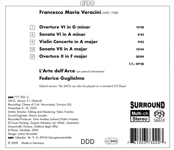 Beschreibung:Runningtime: 00:00:00, Bassoon: Andrea Bressan (2), Cello: Francesco Montaruli, Composed By: Francesco Maria Veracini, Directed By: Federico Guglielmo, Engineer: Marco Lincetto, Harpsichord: Nicola Reniero, Liner Notes: Federico Guglielmo, Oboe: Marco Cera, Oboe: Mark Radcliffe, Orchestra: L'Arte Dell'Arco, Theorbo: Ivano Zanenghi, Theorbo: Pietro Prosser, Viola: Mario Paladin, Viola: Meri Skejic, Violin: Alessia Turri, Violin: Carlo Lazari, Violin: Elisa Imbalzano, Violin: Federico Guglielmo, Violin: Giovanni Guglielmo, Violin: Marco Piantoni, Violin: Stefano Zanchetta, Violin: Valentina Violante, Violone: Massimiliano Mauthe, Violone: Mauthe von Degerfeld, Labelcode CPO777302-2.2 (777 302-2), Recorded At Chiesa di S. Maria Annunziata di Sovizzo Colle, Record Company Classic Produktion Osnabrück, Phonographic Copyright (p) CPO
