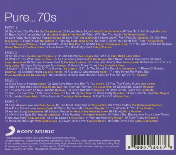 Disc 04 01. Parton, Dolly "I Will Always Love You" 02. Rich, Charlie "The Most Beautiful Girl" 03. Sutherland Brothers, The "Arms Of Mary - Edit" 04. Cash, Johnny "A Thing Called Love" 05. Wynette, Tammy "Stand by Your Man" 06. Presley, Elvis "The Wonder Of You" 07. Denver, John "Annie's Song" 08. Dr. Hook & The MEdecine Show "Sylvia's Mother" 09. Manilow, Barry "Mandy" 10. Garfunkel, Art "I Only Have Eyes For You" 11. Walker Brothers, The "No Regrets - Album Version" 12. Williams, Andy "(Where Do I Begin) Love Story - Love Theme From Love Story" 13. Carmen, Eric "All By Myself" 14. Nilsson, Harry / Nilsson, Harry "Without You" 15. Melanie "Ruby Tuesday" 16. Smith, Patti Group "Because the Night" 17. Cohen, Leonard "Lover Lover Lover - Album Version" 18. DeShannon, Jackie "Bette Davis Eyes"