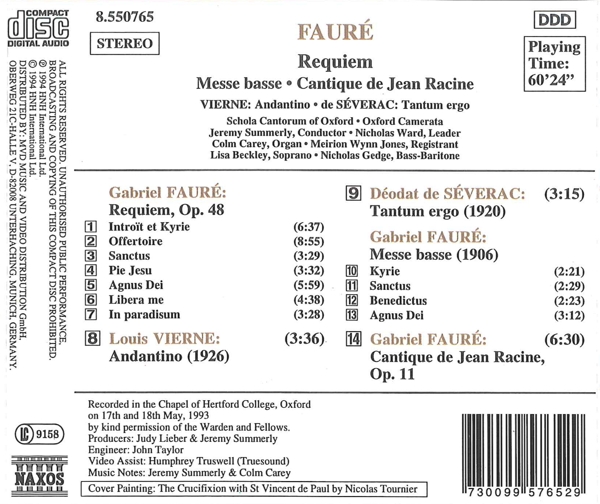 01. Lisa Beckley "Requiem, Op. 48: Introit et Kyrie" 02. Carey, Colm "Requiem, Op. 48: Offertoire" 03. Carey, Colm "Requiem, Op. 48: Sanctus" 04. Lisa Beckley "Requiem, Op. 48: Pie Jesu" 05. Carey, Colm "Requiem, Op. 48: Agnus Dei" 06. Lisa Beckley "Requiem, Op. 48: Libera me" 07. Nicholas Gedge "Requiem, Op. 48: In paradisum" 08. Carey, Colm "Pieces de fantaisie, Op. 51: Suite No. 1" 09. Oxford Schola Cantorum "Tantum ergo" 10. Carey, Colm "Messe basse: Kyrie" 11. Carey, Colm "Messe basse: Sanctus" 12. Carey, Colm "Messe basse: Benedictus" 13. Carey, Colm "Messe basse: Agnus Dei" 14. Carey, Colm "Cantique de Jean Racine, Op. 11"