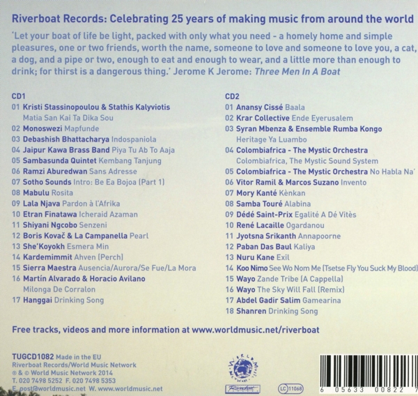 Disc 01 01. Stassinopoulou, Kristi / Kalyviotis, Stathis "Matia San Kai Ta Dika Sou" 02. Monoswezi "Mapfunde" 03. Bhattacharya, Debashish "Indospaniola" 04. Jaipur Kawa Brass Band "Piya Tu Ab To Aaja" 05. Sambasunda Quintet "Kembang Tanjung" 06. Aburedwan, Ramzi "Sans adresse" 07. Sotho Sounds "Intro: Be Ea Bojoa [Part 1]" 08. Mabulu "Rosita" 09. Njava, Lala "Pardon A L'Afrika" 10. Finatawa, Etran "Icheraid Azaman" 11. Ngcobo, Shiyani "Senzeni" 12. Kovac, Boris & La Campanella "Pearl" 13. She'Koyokh "Esmera Min" 14. Kardemimmit "Ahven (Perch)" 15. Sierra Maestra "Ausencia / Aurora / Se Fue / La Mora" 16. Alvarado, Martin / Avilano, Horacio "Milonga De Corralon" 17. Hanggai "Drinking song"