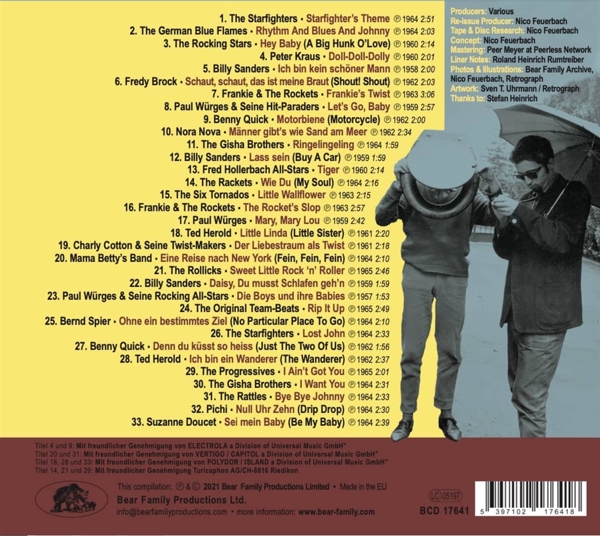 01. Starfighters, The "Starfighter's Theme" 02. German Blue Flames, The "Rhythm And Blues And Johnny" 03. Rocking Stars, The "Hey Baby (A Big Hunk O'Love)" 04. Kraus, Peter "Doll-Doll-Dolly" 05. Sanders, Billy "Ich Bin Kein Sch?ner Mann" 06. Brock, Fredy & Seine Twist-Makers "Schaut, Schaut, Das Ist Meine Braut (Shout! Shout)" 07. Frankie & The Rockets "Frankie's Twist" 08. Würges, Paul & Seine Hit-Paraders "Let's Go, Baby" 09. Quick, Benny "Motorbiene (Motorcycle)" 10. Nora Nova "M?nner Gibt's Wie Sand Am Meer" 11. Gisha Brothers, The "Ringelingeling" 12. Sanders, Billy "Lass Sein (Buy A Car)" 13. Hollerbach, Fred All-Stars "Tiger" 14. Rackets, "Wie Du (My Soul)" 15. Six Tornados, The "Little Wallflower" 16. Frankie & The Rockets "The Rocket's Slop" 17. Würges, Paul "Mary, Mary Lou" 18. Herold, Ted "Little Linda (Little Sister)" 19. Cotton, Charly & Seine Twist-Makers "Der Liebestraum Als Twist" 20. Mama Betty's Band "Eine Reise Nach New York (Fein, Fein, Fein)" 21. Rollicks, The "Sweet Little Rock 'N' Roller" 22. Sanders, Billy "Daisy, Du Musst Schlafen Geh'n" 23. Würges, Paul & Seine Rocking All-Stars "Die Boys Und Ihre Babies" 24. Original Team-Beats, The "Rip It Up" 25. Spier, Bernd "Ohne Ein Bestimmtes Ziel (No Particular Place To Go)" 26. Starfighters, The "Lost John" 27. Quick, Benny "Denn Du Küsst So Heiss (Just The Two Of Us)" 28. Herold, Ted "Ich Bin Ein Wanderer (The Wanderer)" 29. Progressives, The "I Ain't Got You" 30. Gisha Brothers, The "I Want You" 31. Rattles, The "Bye Bye Johnny" 32. Pichi "Null Uhr Zehn (Drip Drop)" 33. Doucet, Suzanne "Sei Mein Baby (Be My Baby)"