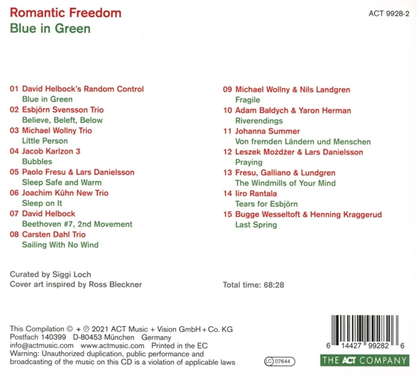 01. Helbock's Random Control, David "Blue in green" 02. Svensson Trio, Esbj?rn "Believe, beleft, below" 03. Wollny Trio, Michael "Little person" 04. Karlzon 3, Jacob "Bubbles" 05. Fresu, Paolo / Danielsson, Lars "Sleep safe and warm" 06. Kühn New Trio, Joachim "Sleep on it" 07. Helbock, David "Beethoven #7 2nd movement" 08. Dahl Trio, Carsten "Sailing with no wind" 09. Wollny, Michael / Landgren, Nils "Fragile" 10. Baldych, Adam / Herman, Yaron "Riverendings" 11. Summer, Johanna "Von fremden L?ndern und Menschen" 12. Mozdzer, Leszek / Danielsson, Lars "Praying" 13. Fresu, Galliano / Lundgren "The windmills of your mind" 14. Rantala, Iliro "Tears of Esbj?rn" 15. Wesseltoft, Bugge / Kraggerud, Henning "Last spring"