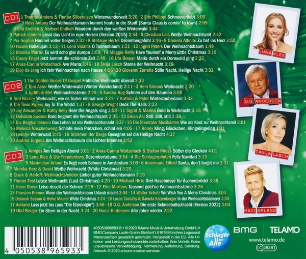 Disc 03 01. Amigos "Am heiligen Abend" 02. Woitschack, Anna-Carina / Mross, Stefan "Süsser die Glocken" 03. Klee, Luna / Freudenberg, Ute "Dezembertr?ume" 04. Schlagerpiloten, Die "Feliz Navidad" 05. Arland, Maximilian "Es liegt noch Schnee in Amsterdam" 06. Eilfeld, Annemarie "Santa, don't forget me" 07. Herz, Monika & David "Weiße Weihnacht (White Christmas)" 08. Cisek & Harloff: Weihnachtshelden "Lieber guter Weihnachtsmann" 09. Fesl, Florian "Letzte Weihnacht (Last Christmas)" 10. Hirte, Michael "Drei Haselnüsse für Aschenbr?del" 11. Sheer, Ireen "Leise rieselt der Schnee" 12. Martens, Elke "Tausend gold'ne Weihnachtssterne" 13. Kremer, Thorsten "Wenn der Weihnachtsmann Urlaub macht" 14. Scholz, Walter "We Wish You A Merry Christmas (Medley)" 15. Sasson, Deborah "White Christmas" 16. Cordalis, Lucas / Katzenberger, Daniela "In der Weihnachtsb?ckerei" 17. Adriano "Lass jetzt los (aus "Die Eisk?nigin")" 18. Anderson, G. G. "Die erste Schneeballschlacht" 19. Berger, Olaf "Ein Stern In Der Nacht" 20. Hinterseer, Hansi "Alle Jahre wieder"