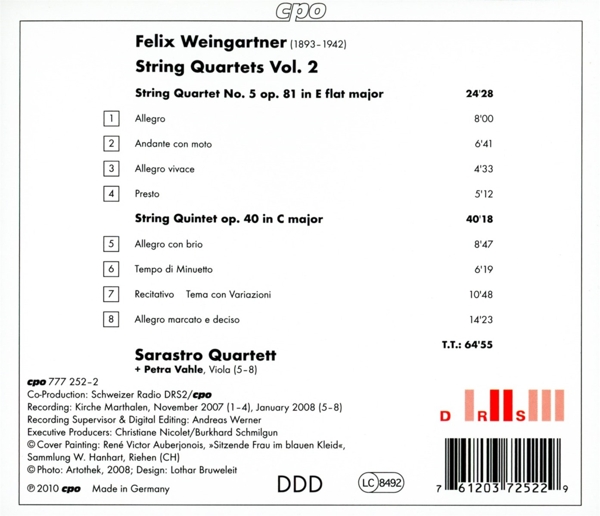 Beschreibung: | Co-producer: DRS 2, Co-producer: cpo, Design: Lothar Bruweleit, Ensemble: Sarastro Quartett, Executive-Producer: Burkhard Schmilgun, Executive-Producer: Christiane Nicolet, Music By: Felix Weingartner, Recording Supervisor [Aufnahmeleitung], Edited By [Digital Editing]: Andreas Werner (4), Viola: Petra Vahle, Labelcode CPO777252.2 (777 252-2, 777 252-2), Phonographic Copyright (p) cpo, Recorded At Kirche Marthalen |