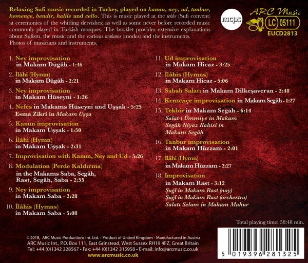 | Beschreibung: | Sufism broadly refers to the esoteric Islamic tradition represented by many strains, most of whom explain the creation of the universe with the principle of Unity of Being. The Sufi understanding is that God is the Sole Being and that all creatures manifest reflections of His Being. Music has always been part of religious rituals, producing forms and styles that remain as basic patterns of the society's musical tradition. Some of the Sufi branches utilized music as a significant spiritual training method whereas some other Sufis relied on other techniques. The Mevlevi order, which follows the path of Rumi, is a leading example of a Sufi branch that accompanies the inner teachings by intensely using the medium of music. Turkish Sufi music has been perfected throughout the ages across many countries. There are two types of Turkish Sufi music: the music employed at the mosque and at the tekke, or convent. This album features relaxing Sufi music recorded in Turkey. These works are played at the tekke at ceremonies of the whirling dervishes, as well as some never before recorded music commonly played in Turkish mosques., Runningtime: 00:00:00, Labelcode ARM2813.2 |