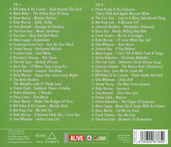 Disc 01 01. Haley, Bill & His Comets "(We're Gonna) Rock Around The Clock" 02. Miller, Mitch "The Yellow Rose Of Texas" 03. Martin, Dean "Mambo Italiano" 04. Murray, Ruby "Softly softly" 05. Bennett, Tony "Stranger in Paradise" 06. Four Aces, The "Mister Sandman" 07. Starr, Kay / Winterhalter, Hugo's Orchestra "Rock and roll waltz" 08. Cogan, Alma "Dreamboat" 09. Ford, Tennessee Ernie "Give me your word" 10. Young, Jimmy "Unchained melody" 11. Laine, Frankie "Cool Water" 12. Clooney, Rosemary "Hey there" 13. Ink Spots, The "Melody of love" 14. Day, Doris "I'll Never Stop Loving You" 15. Sinatra, Frank "Learnin' the blues" 16. Murray, Ruby "Happy Days And Lonely Nights" 17. Ames Brothers, The "The naughty lady of Shady Lane" 18. Clark, Petula "Suddenly there's a valley (English)" 19. Valentine, Dickie "I wonder" 20. Como, Perry "Tina Marie" 21. Martin, Dean "Under The Bridges Of Paris" 22. Haley, Bill & His Comets "Mambo rock" 23. Cole, Nat King "My one sin (Il peccato sei tu)" 24. Murray, Ruby "If Anyone Finds This, I Love You" 25. Whitman, Slim "Indian love call"