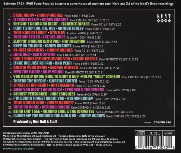01. Hughes, Jimmy "Steal away" 02. Barnett, James "It tears me up" 03. Carter, Clarence "She ain't gonna do right" 04. Conley, Arthur "I can't stop (No, no, no)" 05. Clay, Otis "That kind of lovin'" 06. Del-Rays, The "Fortune teller" 07. Freeman, Art "Slippin' around with you" 08. Barnett, James "Keep on talking" 09. Hughes, Jimmy "Hi heel sneakers" 10. Ben & Spence "Long ago" 11. Greene, Jeanie "Don't make me hate loving you" 12. Penn, Dan "(Take me) just as I am" 13. Jackson, George "Back in your arms" 14. Young, Billy "Feed the flame" 15. Jackson, Ralph ''Soul'' "You really know how to hurt a gay" 16. Carter, Clarence "Thread the needle" 17. Freeman, Art "A piece of my heart" 18. Spooner & Spoons, The "Wish you didn't have to go" 19. Conquest, June "Almost persuaded" 20. Conley, Arthur "I'm gonna forget about you" 21. Barnett, James "Take a good look" 22. Moore, Herman "Come on home" 23. Earl, Richard / Corvettes, The "Blind can't see" 24. Hughes, Jimmy "I worship the ground you walk on"