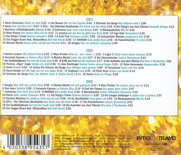 Disc 01 01. Hinterseer, Hansi "Glaub an Dich" 02. Bresan, Uta "Wer ist Ann Sophie" 03. Stimmen der Berge "Was M?nner woll'n" 04. Heino "Geh mal Bier hol'n" 05. ZPur: Die Zillertaler Musikanten "Die Berte isch die H?rte" 06. Fetzig'n aus dem Zillertal, Die "Edelweiß K?nigin" 07. Marilena x MaddaBrassKa "Mambo" 08. Calimeros "Küss mich mon Amour" 09. Blechquetscher "Mit Dir" 10. Pircher, Marc "Die besten Jahre mit Dir" 11. Acarina "Auf der Alm da gibt's koa Sünd" 12. Diah, Ingo "Hoamatlond" 13. Fetzig'n Tiroler, Die "Gemma Aufspiel'n" 14. Echt Tirol "Schnaps Landler" 15. Salzachtaler Mander "Jungbauern-Zeit" 16. Pagger Buam, Die / WüdaraMusi "B?ll b?ll Kern?l" 17. Hannah "Eine Weiße Rose" 18. F?aschtb?nkler "Für Dich" 19. Martin, Monika "Diese Liebe schickt der Himmel" 20. Amigos "Wie ein sch?nes Liebeslied"