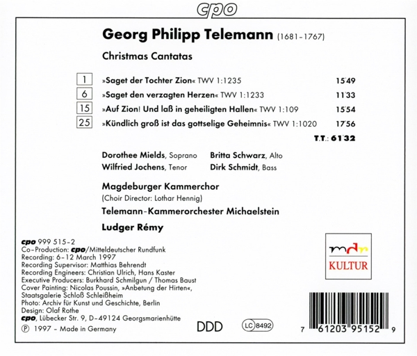 Beschreibung:Alto Vocals: Annekathrin Wollner, Alto Vocals: Claudia Trüe, Alto Vocals: Petra Rosenberg, Alto Vocals: Shirley Radig, Alto Vocals: Silke Kummer, Alto Vocals: Tina Pulst, Alto Vocals, Soloist: Britta Schwarz, Bass Vocals: Bernhard Schneyer, Bass Vocals: Lutz Balzer, Bass Vocals: Patrice Nerlich, Bass Vocals: Rüdiger Herrmann (2), Bass Vocals: Stefan Gericke, Bass Vocals: Stefan Schieren, Bass Vocals: Tobias Hammer, Bass Vocals, Soloist: Dirk Schmidt (2), Bassoon: Thomas Göbel (2), Cello: Monika Schwamberger, Cello: Steffen Hoffmann, Chitarrone: Suzanne van Os, Chorus: Magdeburger Kammerchor, Chorus Master, Bass Vocals: Lothar Hennig, Co-producer: Mitteldeutscher Rundfunk, Composed By: Georg Philipp Telemann, Conductor, Harpsichord: Ludger Rémy, Cover [Painting]: Nicolas Poussin, Double Bass: Andreas Schmidt (8), Engineer: Christian Ulrich, Engineer: Hans Kaster, Ensemble: Telemann-Kammerorchester Michaelstein, Executive-Producer: Burkhard Schmilgun, Executive-Producer: Thomas Baust, Harpsichord, Organ: Sebastian Knebel, Liner Notes: Constanze Holze, Oboe, Oboe d'Amore: Lex Vos, Oboe, Oboe d'Amore: Vincent Van Ballegooijen, Recorder: Ulrike Volkhardt, Recorder, Flute: Manfredo Zimmermann, Recording Supervisor: Matthias Behrendt, Soprano Vocals: Andrea Reichert, Soprano Vocals: Anita Weichold, Soprano Vocals: Anke Rechten, Soprano Vocals: Conny Lampert, Soprano Vocals: Kathrin Mägdefessel, Soprano Vocals: Kristin Hentschel, Soprano Vocals: Mechtild Stephan, Soprano Vocals: Nicole Jebauer, Soprano Vocals: Sabine Münz, Soprano Vocals: Susanne Hammer, Soprano Vocals: Ulrike Detert, Soprano Vocals, Soloist: Dorothee Mields, Tenor Vocals: Carsten Gerth, Tenor Vocals: Gabor Scheinpflug, Tenor Vocals: Marko Meissner, Tenor Vocals: Stefan Lill, Tenor Vocals: Tobias Wollner, Tenor Vocals, Soloist: Wilfried Jochens, Timpani: Viorel Chiriacescu, Trumpet: Matthias Schmeiß, Trumpet: Michael Heinrich, Trumpet: Sandra Godescheit, Viola: Hans Salger, Viola: Klaus Voigt, Viola: Thordes Hohbach, Viola: Ursel Kessl, Violin: Cornelia Fiedler, Violin: Daniel Deuter, Violin: Jochen Grüner, Violin: Maria Thom, Violin: Michael Gusenbauer, Violin: Paul Herrera, Violin: Ruth Ellner, Violin: Ulla Schneider, Labelcode CPO999515-2.2 (999 515-2), Phonographic Copyright (p) cpo, Record Company Classic Produktion Osnabrück