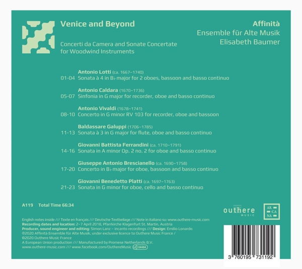 Beschreibung:Venice ca. 1700: having recently arrived from France, the instruments a la mode- the oboe, bassoon, baroque recorder, and flute traversiere- go on to conquer the musical centers of the Serenissima. The versatility of these new woodwinds inspires Vivaldi at the Ospedale della Pieta and his compatriots Caldara and Lotti at San Marco throughout their lives, whether in Venice, Rome, Vienna, or Dresden. This interest in wind instruments also carries over to the next generation of Venetian composers such as Galuppi, whose career plays out in his hometown, or the emigrants Platti and Brescianello beyond the Alps. For centuries, the imperial chapel in Vienna was characterized by a particular affinity for Venice- and it was with an eye to this historical connection between Vienna and Northern Italy that oboist Elisabeth Baumer founded the Austro-Italian Ensemble Affinita with musician friends in 2012. The ensemble's debut recording brings together imaginative interpretations of well-known works such as Vivaldi's Concerto RV 103, exciting rediscoveries, and a world premiere recording of a remarkable oboe sonata by Ferrandini., Runningtime: 00:00:00, Labelcode ARC119.2