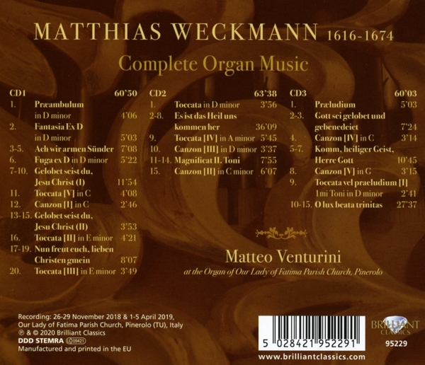 Disc 01 01. "Pr?ambulum a 5 d-moll" 02. "Fantasia d-moll" Ach wir armen Sünder 03. "1. Vers 1 (Choral in tenor)" 04. "2. Vers 2 (? 2 Clav. ? Ped.)" 05. "3. Vers 3 (? 2 Clav.)" 06. "Fuge d-moll" Gelobet seist du, Jesu Christ (Auszug) 07. "1. Vers 1 (? 4)" 08. "2. Vers 2 (Auff 2 Clavir)" 09. "3. Vers 3 (Auff 2 Clavir ? 4)" 10. "4. Vers 4 (? 3)" 11. "Toccata C-Dur" 12. "Canzon C-Dur" Gelobet seist du, Jesu Christ 13. "1. Vers 1 (? 4)" 14. "2. Vers 2 (Auff 2 Clavir)" 15. "3. Vers 3 (? 3 voc.)" 16. "Toccata e-moll" Nun freut euch, lieben Christen g'mein (Partita) 17. "1. Vers 1" 18. "2. Vers 2 (Auff zwey Clavier)" 19. "3. Vers 3" 20. "Toccata e-moll"