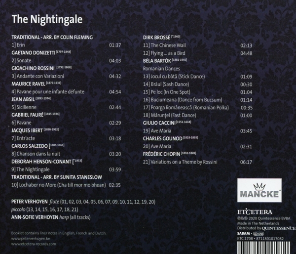 01. Verhoyen, Peter "Erin (bearb. von Colin Fleming)" 02. Verhoyen, Peter "Sonate für Fl?te und Harfe" 03. Verhoyen, Peter "Andante con variazioni (für Fl?te und Harfe)" 04. Verhoyen, Peter "Pavane pour une Infante d?funte" 05. Verhoyen, Peter "Sicilienne" 06. Verhoyen, Peter "Pavane op. 50" 07. Verhoyen, Peter "Entr'acte (für Fl?te und Harfe)" 08. Verhoyen, Ann-Sofie "Chanson dans la nuit" 09. Verhoyen, Peter "The Nightingale" 10. Verhoyen, Peter "Lochaber no More (Cha till mor mo bhean) (bearb. von Sunita Staneslow)" 11. Verhoyen, Peter "The Chinese wall" 12. Verhoyen, Peter "Flying... as a bird" Rum?nische Volkst?nze Sz 56 (für Panfl?te und Harfe) 13. Verhoyen, Peter "Nr. 1 Jocul cu b?ta (Stocktanz)" 14. Verhoyen, Peter "Nr. 2 Br?ul (Schleiertanz)" 15. Verhoyen, Peter "Nr. 3 Pe loc (An einem Fleck)" 16. Verhoyen, Peter "Nr. 4 Buciumeana (Tanz aus Bucsum)" 17. Verhoyen, Peter "Nr. 5 Poarga Rom?neasca (Rum?nische Polka)" 18. Verhoyen, Peter "Nr. 6 Maruntel (Schneller Tanz)" 19. Verhoyen, Peter "Ave Maria" 20. Verhoyen, Peter "Ave Maria" 21. Verhoyen, Peter "Variationen über Non pi? mesta aus Rossinis La Cenerentola op. posth."