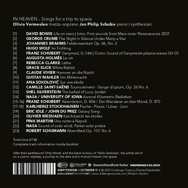 1. LIFE ON MARS - INTRO: FIRST SOUNDS FROM MARS-ROVER PERSEVERANCE 2021 2. APPARITION: THE NIGHT IN SILENCE UNDER MANY A STAR 3. FELDEINSAMKEIT, OP. 86, NO. 2 4. IM FRUHLING 5. GANYMED, D. 544 - OUTRO: SOUND OF GANYMEDE PLASMA WAVES GII G1 6. LES SEPT IVRESSES: II. LE VIN 7. LETHE 8. WHITE RABBIT 9. HYMNEN AN DIE NACHT 10. UM MITTERNACHT 11. TANZER LIEDER: I. SUR UNE ETOILE 12. MELODIES PERSANES, OP. 26: VI. TOURNOIEMENT (SONGE D'OPIUM) 13. THE BALLAD OF LUCY JORDAN 14. AURORAL KILOMETRIC RADIATION 15. ABENDSTERN, D. 806 16. DER WANDERER AN DEN MOND, D. 870 17. TIERKREIS - 12 MELODIEN DER STERNZEICHEN: VI. FISCHE - PISCES 18. TIERKREIS - 12 MELODIEN DER STERNZEICHEN: XIV. LOWE - LION 19. GALAXY SONG 20. KATCHIKATCHI LES ETOILES 21. UNA NOTTE A NAPOLI 22. SOUND OF SOLAR WIND, PARKER SOLAR PROBE 23. ABENDLIED, OP. 107, NO. 6 |
