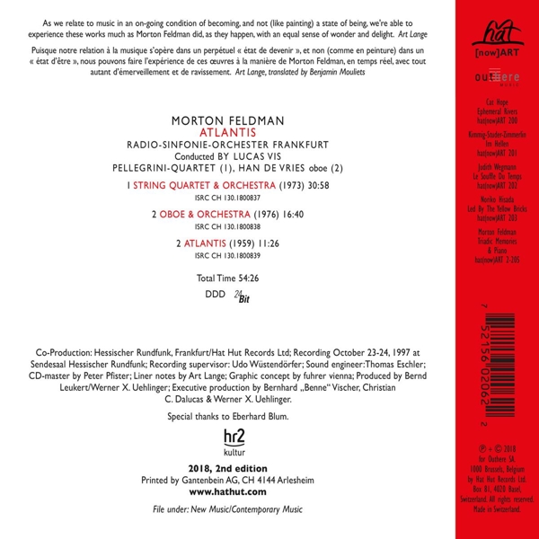 Beschreibung:"As we relate to music in an on-going condition of becoming, and not (like painting) a state of being, we're able to experience these works much as Morton Feldman did, as they happen, with an equal sense of wonder and delight." (Art Lange) A major figure in 20th-century music, Morton Feldman was a pioneer of indeterminate music, a development associated with the experimental New York School of Composers. Feldman's works are characterized by notational innovations that he developed to create his characteristic sound: rhythms that seem to be free and floating, pitch shadings that seem softly unfocused, a generally quiet and slowly evolving music, and recurring asymmetric patterns. He wrote the title track of this album, Atlantis, in 1959., Runningtime: 00:00:00, Co-producer [Co-Production]: Hat Hut Records, Ltd., Co-producer [Co-Production]: Hessischer Rundfunk, Composed By: Morton Feldman, Conductor [Radio-Sinfonie-Orchester Frankfurt Conducted By]: Lucas Vis, Design Concept [Graphic Concept]: fuhrer vienna, Engineer [Sound Engineer]: Thomas Eschler, Executive-Producer [Executive Production]: Bernhard Vischer, Executive-Producer [Executive Production]: Christian Dalucas, Executive-Producer [Executive Production]: Werner X. Uehlinger, Liner Notes: Art Lange, Liner Notes [Translated By]: Benjamin Mouliets, Mastered By [CD-master]: Peter Pfister, Orchestra: Radio-Sinfonie-Orchester Frankfurt, Producer: Bernd Leukert, Producer: Werner X. Uehlinger, Recording Supervisor: Udo Wüstendörfer, Ensemble [String Quartet]: Pellegrini-Quartett, Oboe: Han de Vries, Labelcode HAHT206.2 (hat[now]ART 206), Record Company hr2 kultur, Record Company Outhere S.A., Record Company Outhere Music, Phonographic Copyright (p) Hat Hut Records Ltd., Copyright (c) Hat Hut Records Ltd., Made By www.adon.ch, Recorded At Sendesaal Hessischer Rundfunk, Printed By Gantenbein AG