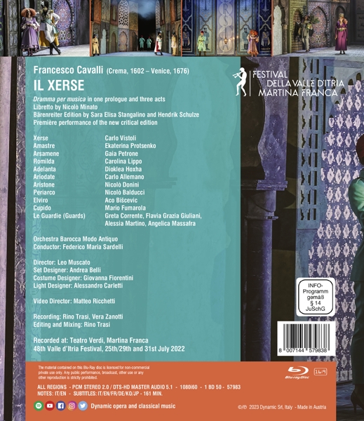 Beschreibung:?Francesco Cavalli succeeded Monteverdi as the most influential composer of the new genre of opera that emerged in mid-17th-century Venice. Il Xerse is a fictitious dramma per musica that tells of Persian King Xerxes' love for Romilda, who in turn is in love with his brother Arsamene. The plot is an entertaining and extremely intricate human comedy of crossed loves, court intrigues and disguises - the work's popularity saw it staged in Paris at the wedding of Louis XIV and Maria Theresa of Spain. Since overshadowed by Handel's later Xerxes, this Martina Franca production is the first in modern times., Runningtime: 00:00:00, Labelcode DNMC57983BR