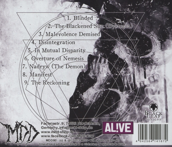 01. "Blinded" 02. "The blackened sun (Dystopia)" 03. "Malevolence demised" 04. "Disintegration" 05. "In mutual disparity" 06. "Overture of Nemesis" 07. "Nadryw (The demon)" 08. "Manifest" 09. "The reckoning"