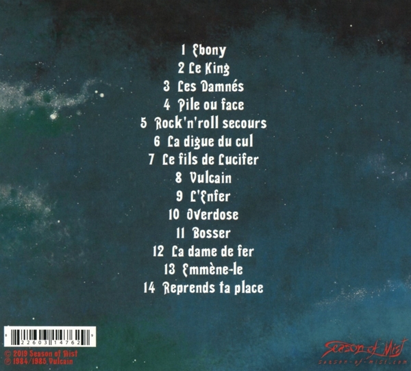 01. "Ebony" 02. "Le king" 03. "Les damn?s" 04. "Pile ou face" 05. "Rock'n'roll secours" 06. "La digue du cul" 07. "Le fils de Lucifer" 08. "Vulcain" 09. "L'enfer" 10. "Overdose" 11. "Bosser" 12. "La dame de fer" 13. "Emm?ne-le" 14. "Reprends ta place"