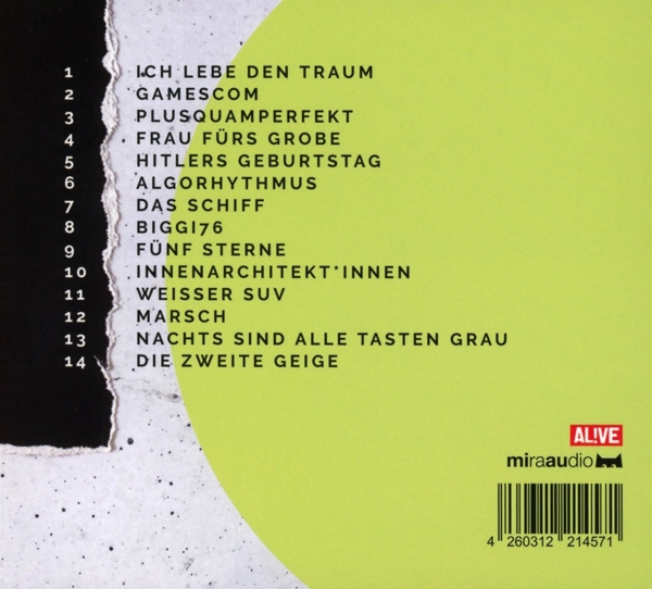 01. "Ich lebe den Traum" 02. "Gamescom" 03. "Plusquamperfekt" 04. "Frau fürs Grobe" 05. "Hitlers Geburtstag" 06. "Algorhythmus" 07. "Das Schiff" 08. "Biggi76" 09. "Fünf Sterne" 10. "Innenarchitekt*innen" 11. "Weißer SUV" 12. "Marsch" 13. "Nachts sind alle Tasten grau" 14. "Die zweite Geige"