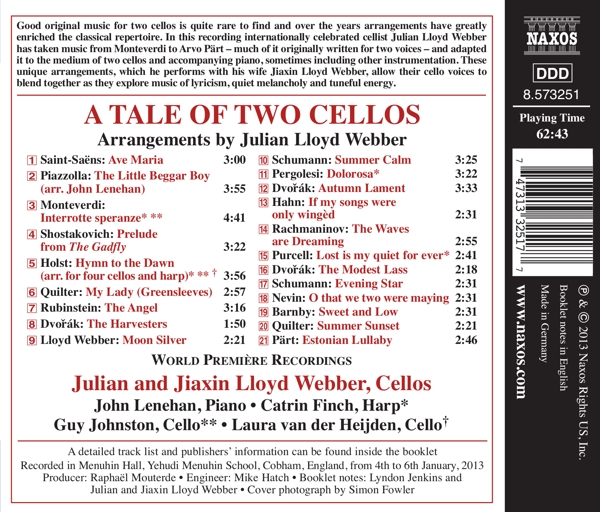 01. Jiaxin, Lloyd-Webbe "Ave Maria (bearb. von Julian Lloyd Webber)" 02. Jiaxin, Lloyd-Webbe "Chiquil¡n de bach¡n (bearb. von John Lenehan)" Madrigali Libro 7 (Madrigalbuch 7) (Auszug) 03. Finch, Catrin "Interrotte speranze (bearb. von Julian Lloyd Webber)" Die Hornisse (The Gadfly) op. 97a (Filmmusik-Suite) (Auszug) 04. Jiaxin, Lloyd-Webbe "Prelude (bearb. von Julian Lloyd Webber)" 05. Finch, Catrin "Hymn to the dawn (bearb. für 4 Violoncelli und Harfe von Julian Lloyd Webber)" 06. Jiaxin, Lloyd-Webbe "My Lady (Greensleeves) (bearb. von Julian Lloyd Webber)" 07. Jiaxin, Lloyd-Webbe "De Engel op. 48 Nr. 1 (bearb. von Julian Lloyd Webber)" Duette op. 38 (Kl?nge aus M?hren) (Auszug) 08. Jiaxin, Lloyd-Webbe "Nr. 3 The harvesters (bearb. von Julian Lloyd Webber)" 09. Jiaxin, Lloyd-Webbe "Moon Silver" 10. Jiaxin, Lloyd-Webbe "Sommerruh o. op. (Duett) (bearb. von Julian Lloyd Webber)" Stabat Mater (Auszug) 11. Finch, Catrin "Dolorosa (bearb. von Julian Lloyd Webber)" Duette op. 38 (Kl?nge aus M?hren) (Auszug) 12. Jiaxin, Lloyd-Webbe "Nr. 4 Autumn lament (bearb. von Julian Lloyd Webber)" 13. Jiaxin, Lloyd-Webbe "Si mes vers avaient des ailes (bearb. von Julian Lloyd Webber)" Ch?re op. 15 Nr. 1-6 (Auszug) 14. Jiaxin, Lloyd-Webbe "Nr. 4 The waves are dreaming (bearb. von Julian Lloyd Webber)" 15. Finch, Catrin "Lost is my Quiet for ever Z 502 (bearb. von Julian Lloyd Webber)" Duette op. 32 Nr. 1-13 (Kl?nge aus M?hren) 16. Jiaxin, Lloyd-Webbe "Nr. 8 The modest lass (bearb. von Julian Lloyd Webber)" Lieder op. 103 (Duette) (Auszug) 17. Jiaxin, Lloyd-Webbe "Nr. 4 An den Abendstern (bearb. von Julian Lloyd Webber)" 18. Jiaxin, Lloyd-Webbe "O that we two were maying (bearb. von Julian Lloyd Webber)" 19. Jiaxin, Lloyd-Webbe "Sweet and low (bearb. von Julian Lloyd Webber)" 20. Jiaxin, Lloyd-Webbe "Summer sunset (bearb. von Julian Lloyd Webber)" 21. Jiaxin, Lloyd-Webbe "Estonian Lullaby (bearb. von Julian Lloyd Webber)"