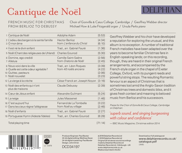 | Beschreibung: | Geoffrey Webber and his choir have developed a reputation for exploring the unusual, and this album is no exception. A number of traditional French melodies have been adapted over the years to become familiar Christmas fare in English-speaking lands; on this recording, though, they are heard in their original French arrangements, and accompanied by the French-style organ in the chapel of Exeter College, Oxford, with it's pungent reeds and powerful string stops. The resulting Romantic fervor is an aspect of Christmas that is sometimes lost amid the Anglo-Saxon tradition of Christmas trees and domestic bliss, and it gives fresh context and meaning to beloved music from Berlioz and his successors. The Choir of Gonville & Caius College, Cambridge, is one of the UK's leading collegiate choirs, with a world-wide reputation based on it's extensive touring, it's exciting programme of concerts and broadcasts, and highly acclaimed recordings. The choir consists of 24 singers, 2 organists and the Director, Dr Geoffrey Webber. It's history stems from the late nineteenth century when the choir was directed by the composer Charles Wood., Runningtime: 00:00:00, Labelcode DELP34197.2 |
