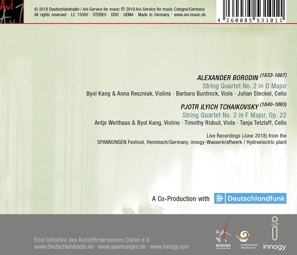 Beschreibung:Many Russian instrumental works of the 19th century were based on a programme, and the same holds true of Alexander Borodin's Second String Quartet. Here the underlying subject was the great love he felt for his wife Ekaterina. In 1877, the composer (who was also a doctor and a chemist) travelled to Heidelberg, where he had met her 16 years earlier. In letters he described to her how he was returning to the spots they had visited together, and added: "I would give anything to have you here at my side." Borodin finished writing the D Major Quartet on a date that was likewise symbolic: on August 10, 1881, their twentieth anniversary. Tchaikovsky managed to make ends meet by teaching, until his concert overture The Tempest (1873) drew widespread attention to his talent as a composer. In high spirits after that resounding success, Tchaikovsky euphorically wrote his Second String Quartet in the course of one night in January 1874. This work is even more elaborate and mature than the more well-known First String Quartet, with which he had attempted to supplement his meager professor's salary in 1871. He certainly had less trouble composing the Second Quartet: "I regard it as my best work; no other piece has poured forth from me so simply and easily. I wrote it almost in one sitting.", Runningtime: 00:00:00, Engineer [Balance Engineer]: Stefan Heinen, Executive-Producer: Christoph Schmitz, Liner Notes: Lars Vogt, Liner Notes: Matthias Corvin, Liner Notes: Pedro Obiera, Liner Notes [Übersetzungen / Translations]: Stanley Hanks, Photography By: Bob Studio, Photography By: Giorgia Bertazzi, Photography By: Heike Fischer, Photography By: Irène Zandel, Photography By: Kaupo Kikkas, Photography By: Lars Vogt, Photography By: Marco Borggreve, Producer [Recording Producer], Edited By [Editing], Mastered By [Mastering]: Stephan Schmidt, Cello: Julian Steckel, Composed By: Alexander Borodin, Viola: Barbara Buntrock, Violin: Anna Reszniak, Violin: Byol Kang, Cello: Tanja Tetzlaff, Composed By: Pyotr Ilyich Tchaikovsky, Viola: Timothy Ridout, Violin: Antje Weithaas, Violin: Byol Kang, Labelcode AVRR8553101.2 (8553101, 42 6008553101 1), Phonographic Copyright (p) Avi-Service For Music, Copyright (c) Avi-Service For Music, Copyright (c) DeutschlandRadio, Copyright (c) Heike Fischer, Copyright (c) Matthias Corvin, Copyright (c) Pedro Obiera, Recorded At Wasserkraftwerk Heimbach