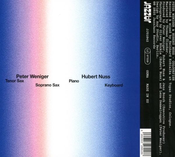 Beschreibung:Saxophonist Peter Weniger und Pianist Hubert Nuss sind "together again! Auf ihrem neuen Album "Colourfish (JazzJazz) halten sie einmal mehr innige Zweisprache, schweben auf sphärisch-geheimnisvollen, elektronischen Klangteppichen über Berge, durchstreifen magische Landschaften, suchen geduldig nach den weniger betretenen Pfaden und entscheiden sich doch immer für den richtigen Weg. Was sie am Wegesrand ihrer freundschaftlich-vertrauten Musikspaziergänge entdecken, aufmerksam betrachten und au...