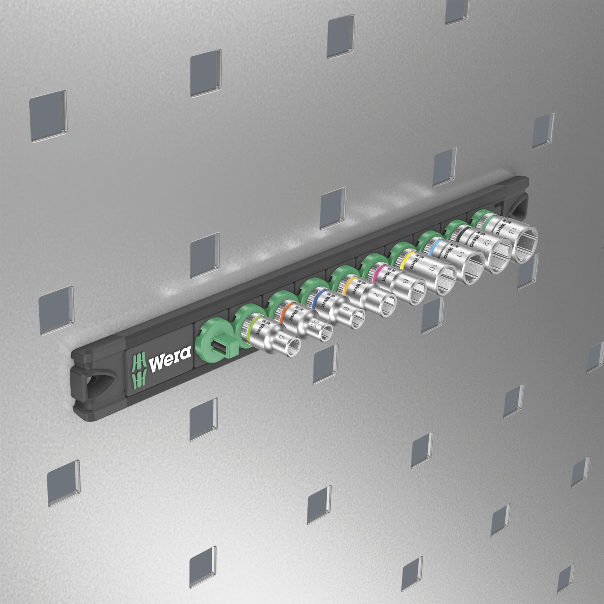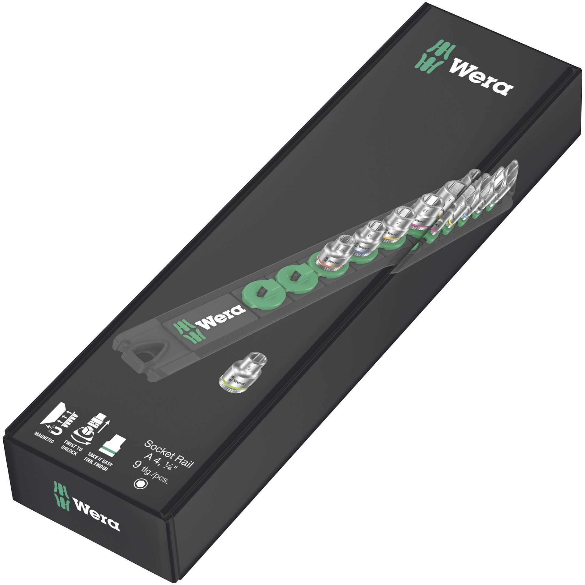 Die Nuss-Magnetleiste A 4 Zyklop Steckschlüsseleinsatz-Satz 1/4" von Wera ist ein hochwertiges Werkzeugset für Profis und anspruchsvolle Heimwerker. Die kompakte Magnetleiste hält vier erstklassige Stecknüsse aus robustem Chrom-Vanadium-Stahl sicher fest und schützt sie vor Verlust oder Beschädigung beim Transport oder bei der Aufbewahrung. Dank des innovativen Magnetsystems sind die Einsätze stets griffbereit und übersichtlich angeordnet ? ideal für präzise Arbeiten im Maschinenbau, bei Kfz-Reparaturen oder Montagearbeiten mit Antriebsteilen im Viertel-Zoll-Format (1/4"). Ergonomisch geformte Komponenten sorgen auch bei längeren Einsätzen für angenehmes Handling ohne Ermüdung der Hände. Der Hersteller Wera steht seit Jahrzehnten für Qualität und Innovation; Nachhaltigkeit wird durch den Einsatz umweltfreundlicher Materialien sowie energieoptimierte Fertigungsprozesse aktiv gefördert ? so leisten Käufer dieses Produkts einen wertvollen Beitrag zum Umweltschutz.