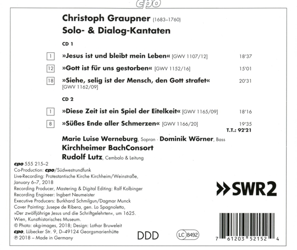 Disc 01 Jesus ist und bleibt mein Leben GWV 1107/12 (Kantate) 01. "Arioso: Jesus ist und bleibt mein Leben" 02. "Recitativo secco: So liebstu mich von ganzem Herzen" 03. "Arioso da capo" 04. "Recitativo secco: Wie aber, wenn dich Kreuz und Leiden drückte" 05. "Arioso da capo" 06. "Recitativo secco: O Seele, diese Triebe" 07. "Arie: Sollt' ich dich nicht, geliebter Jesu, lieben" 08. "Recitativo secco: Die Worte geh'n dir itzt von Herzen" 09. "Arioso da capo" 10. "Recitativo secco: Wohlan!" 11. "Arie: Ach, wie will ich dich umfassen" Gott ist für uns gestorben GWV 1152/16 (Kantate) 12. "Recitativo accompagnato: Gott ist für uns gestorben" 13. "Arie: Ich bin's, o Gott, ich bin's" 14. "Recitativo secco: Das machen meine Sünden, o Gott" 15. "Arie: Tilge meine Missetat" 16. "Recitativo secco: Gott wird um Jesu Christi willen" 17. "Arie: Beherzt, mein Herz!" Siehe, selig ist der Mensch, den Gott strafet GWV 1162/09 (Kantate) 18. "Sonate" 19. "Arie und Dictum: Siehe, selig ist der Mensch, den Gott strafet" 20. "Recitativo secco: Das Kreuz und auch ein Christ" 21. "Arie: Ach, der Kreuzgang ist mein Glück" 22. "Recitativo secco: Zudem kann doch das Kreuz nicht ewig w?hren" 23. "Arie mit Violinen: Drücke mich immer beschwerliche Last"