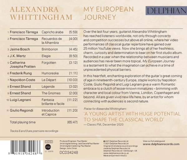 Beschreibung: | Runningtime: 00:00:00, Classical Guitar: Alexandra Whittingham, Producer, Engineer: Paul Baxter, Composed By: Francisco Tárrega, Composed By: Francisco Tárrega, Composed By: Jaime Felipe José Bosch, Composed By: Kaspar Joseph Mertz, Composed By: Catharina Josepha Pratten, Composed By: Frederik Rung, Composed By: Napoléon Coste, Composed By: Ernest Shand, Composed By: Ernest Shand, Composed By: Luigi Legnani, Composed By: Giulio Regondi, Labelcode DCD34248, Record Company Delphian Records Ltd., Phonographic Copyright (p) Delphian Records Ltd., Copyright (c) Delphian Records Ltd. |