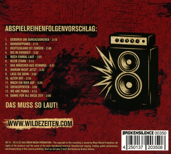 Wilde Zeiten sind zurück! Mit ihrem neuen Album "Noch einmal laut, liefern die vier Musiker wieder eine rohe, emotionale Momentaufnahme - laut und voller Leben. Ehrlicher Punkrock mit deutschen Texten, die vielen aus der Seele sprechen und das wie immer mit diesen so Band-typischen Mitsing-Refrains. Erscheint als CD auf dem Bandeigenen Label Rhein Musik Produktion. "Noch einmal laut erzählt von dem, was die Jungs gerade beschäftigt, von Gesellschaftsthemen, Freundschaften und Parties - von...