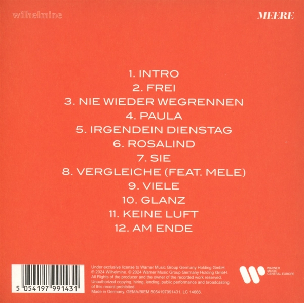 01. Schneider, Wilhelmine "Intro" 02. Schneider, Wilhelmine "frei" 03. Schneider, Wilhelmine "nie wieder wegrennen" 04. Schneider, Wilhelmine "Paula" 05. Schneider, Wilhelmine "irgendein Dienstag" 06. Schneider, Wilhelmine "Rosalind" 07. Schneider, Wilhelmine "sie" 08. Moglii, Wilhelmine, "Vergleiche" 09. Schneider, Wilhelmine "viele" 10. Schneider, Wilhelmine "Glanz" 11. Schneider, Wilhelmine "keine Luft" 12. Schneider, Wilhelmine "am Ende"