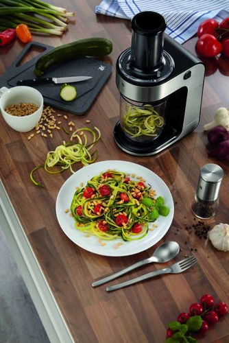 Beschreibung:Der WMF Kult X Spiralschneider aus mattem Cromargan® schneidet auf Knopfdruck in Sekundenschnelle gesunde Gemüsenudeln aus Zucchini, Karotten oder roter Beete. Je nach Wunsch schneiden die 3 Schneideeinsätze mit WMF Perfect Cut Technologie Tagliatelle, Linguine oder Spaghetti einfach und schnell. Hauptmerkmale Leistung 80 Watt Geschwindigkeitsstufen 1 Fassungsvermögen Auffangbehälter 1,25l Spühlmaschinengeeignet Alle abnehmbaren Teile sind spülmaschinengeeignet. Kabellänge 0,9 m Material Cromargan® Zubehör 3 Schneideeinsätze Auffangbehälter Stopfer Produktgröße(HxBxT) 36,5 x 14,5 x 22,5 Produktgewicht 1,83 kg Features Inklusive 3 extrascharfer Schneideinsätze mit WMF Perfect Cut Technologie für Tagliatelle (ca. 9mm), Linguine (ca. 5mm), Spaghetti (ca. 3mm). Hochwertiges Cromargan®matt Gehäuse mit abnehmbarer transparenter Einfüllöffnung Einfache Reinigung - alle abnehmbaren Teile sind spülmaschinengeeignet. Sichere Handhabung dank innenliegender Schneideinheit Kindersicherungs-Funktion